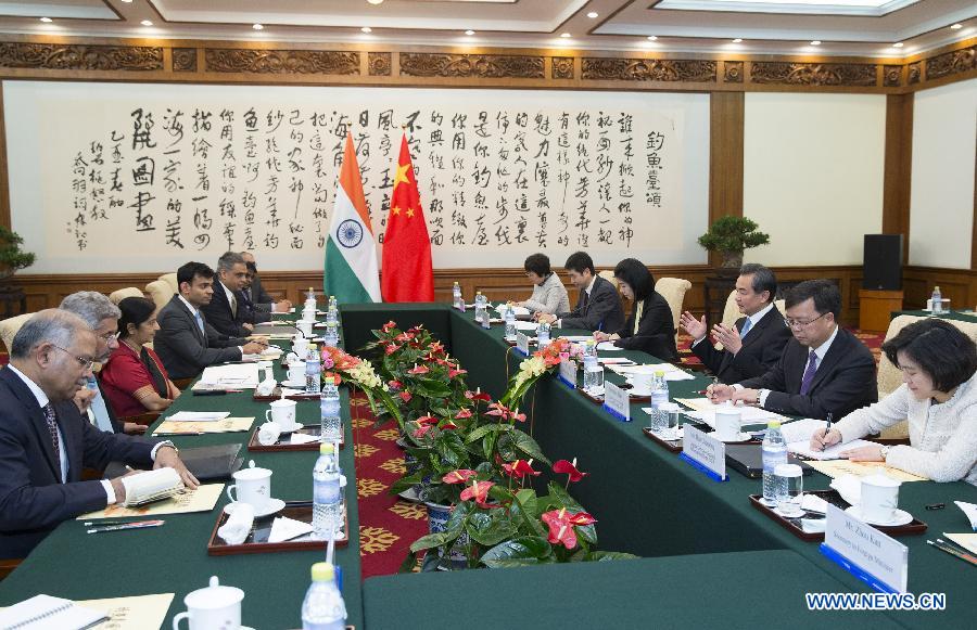 Chinese Foreign Minister Wang Yi (3rd R) meets with his Indian counterpart Sushma Swaraj (3rd L) in Beijing, China, Feb. 1, 2015. (Xinhua/Huang Jingwen)