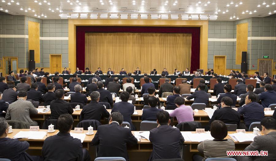Chinese Vice Premier Zhang Gaoli (C rear) presides over a meeting focused on the "Belt and Road" initiatives, or the building of the Silk Road Economic Belt and the 21st Century Maritime Silk Road, in Beijing, capital of China, Feb. 1, 2015. (Xinhua/Huang Jingwen) |