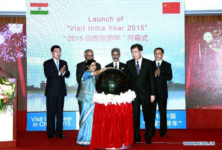 Chinese Vice Premier Wang Yang (R front) and Indian External Affairs Minister Sushma Swaraj (L front) attend the launching ceremony of "Visit India Year 2015" in Beijing, capital of China, Feb. 2, 2015. (Xinhua/Pan Xu)