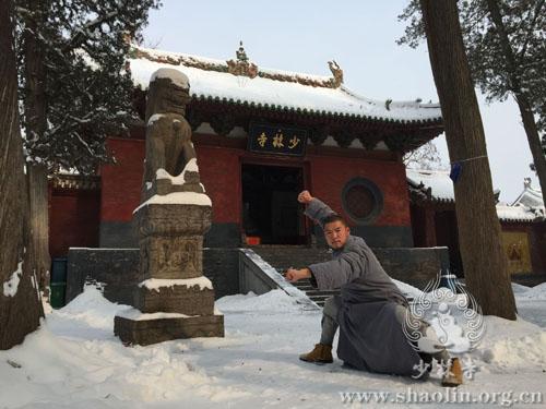 Shaolin Temple ushered in the first snow this year on Jan. 28, 2015. The snow ended early the next morning. Despite the bone-chilling cold, the monks in the temple practiced martial arts as usual in the snow. (Photo/shaolin.org.cn)