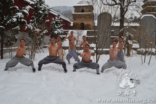 Shaolin Temple ushered in the first snow this year on Jan. 28, 2015. The snow ended early the next morning. Despite the bone-chilling cold, the monks in the temple practiced martial arts as usual in the snow. (Photo/shaolin.org.cn)