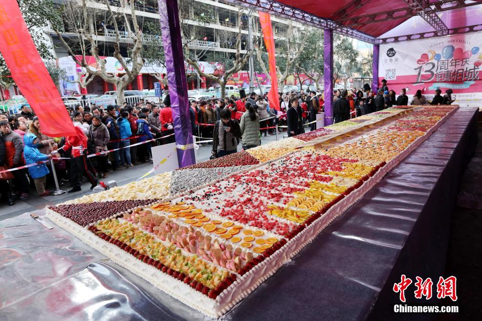 A 24-square-metre cake, made of fresh fruits including pineapple and strawberry is exhibited in Huaibei, east China's Anhui province on Jan. 18, 2015. Nine cooks spent more than eight hours to finish this cake. More than 5000 residents could taste this cake. (CNS/Wan Shanchao) |