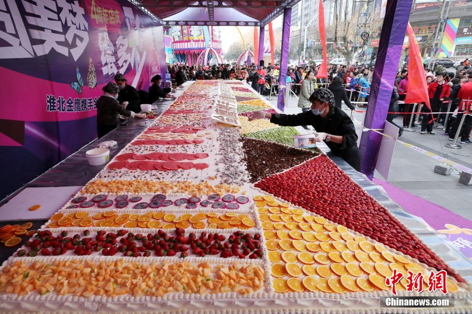 A 24-square-metre cake, made of fresh fruits including pineapple and strawberry is exhibited in Huaibei, east China's Anhui province on Jan. 18, 2015. Nine cooks spent more than eight hours to finish this cake. More than 5000 residents could taste this cake. (CNS/Wan Shanchao) |