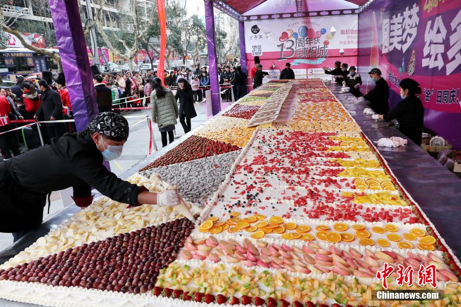 A 24-square-metre cake, made of fresh fruits including pineapple and strawberry is exhibited in Huaibei, east China's Anhui province on Jan. 18, 2015. Nine cooks spent more than eight hours to finish this cake. More than 5000 residents could taste this cake. (CNS/Wan Shanchao)