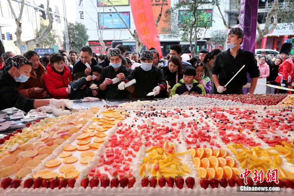 A 24-square-metre cake, made of fresh fruits including pineapple and strawberry is exhibited in Huaibei, east China's Anhui province on Jan. 18, 2015. Nine cooks spent more than eight hours to finish this cake. More than 5000 residents could taste this cake. (CNS/Wan Shanchao)