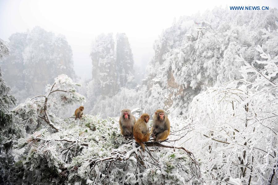 Photo taken on Feb. 3, 2015 shows macaques on snow-covered tree branches at Wulingyuan National Park in Zhangjiajie City, central China's Hunan Province. (Xinhua/Zhang Mingtao)