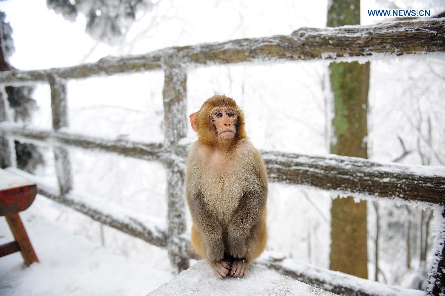 Photo taken on Feb. 3, 2015 shows a macaque at snow-covered Wulingyuan National Park in Zhangjiajie City, central China's Hunan Province. (Xinhua/Zhang Mingtao)