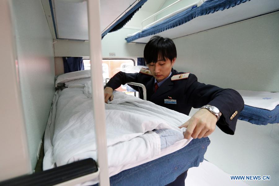 A staff member puts away beds in a train at a train depository of the Beijing Railway Bureau in Beijing, capital of China, Feb. 2, 2015. A 40-day spring festival travel rush will soon begin, during which the Beijing Railway Station is expected to send 4.2 million passengers and receive 4.3 million passengers. The station has taken out measures to better serve passengers on their way.(Xinhua/Shen Bohan) |