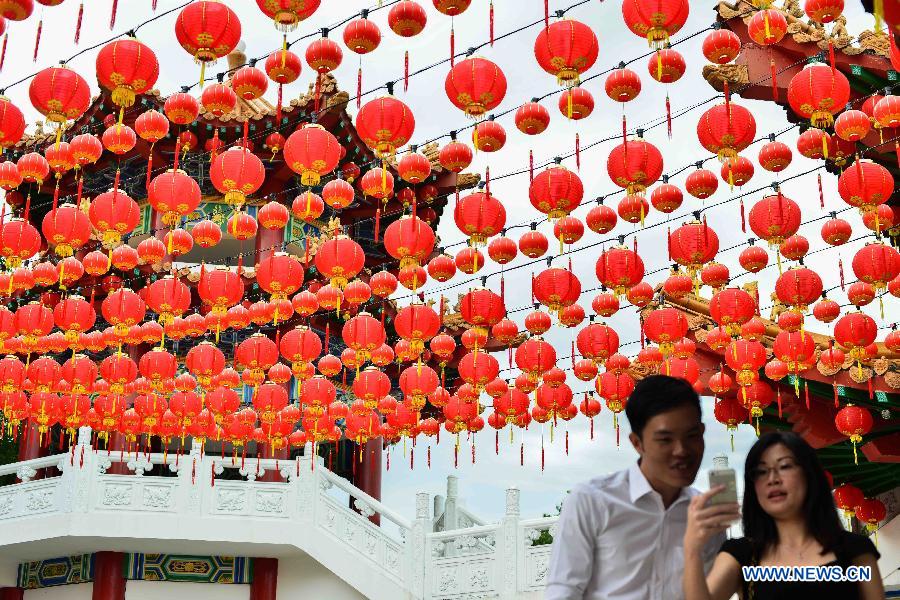 Tourists take pictures under red lanterns for the upcoming Chinese Spring festival in Kuala Lumpur, Malaysia, Feb. 4, 2015. (Xinhua/Chong Voon Chung)
