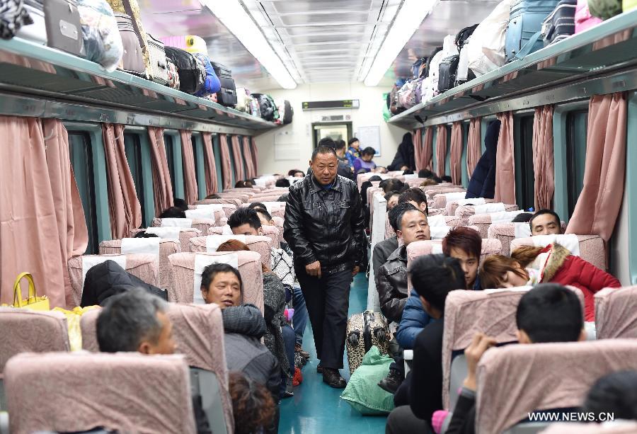 A man walks on train K5612 from Hangzhou, capital of east China's Zhejiang Province, to Fuyang of east China's Anhui Province, Feb. 4, 2015. The 40-day travel frenzy known as "chunyun", the hectic period through the Chinese lunar New Year, or the Spring Festival, which falls on Feb. 19 this year, began on Feb. 4 and will last until March 16. Train 5612 is the first chunyun train from Hangzhou. (Xinhua/Han Chuanhao) |