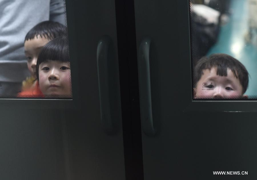 Children look out of train K5612 in Hangzhou, capital of east China's Zhejiang Province, Feb. 4, 2015. The 40-day travel frenzy known as "chunyun", the hectic period through the Chinese lunar New Year, or the Spring Festival, which falls on Feb. 19 this year, began on Feb. 4 and will last until March 16. Train 5612 from Hangzhou to Fuyang of east China's Anhui Province is the first chunyun train from Hangzhou. (Xinhua/Han Chuanhao) |