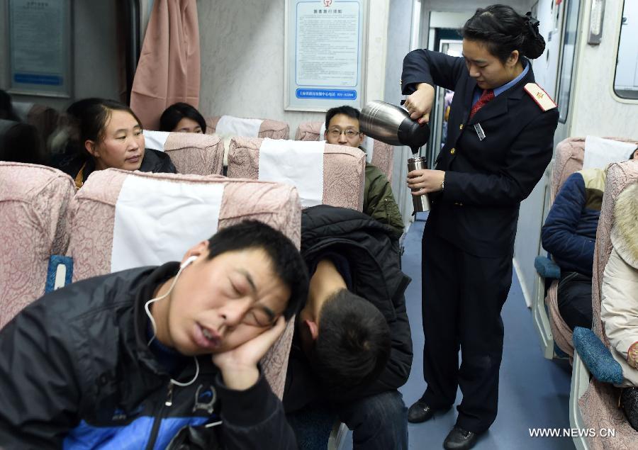 Attendant Fan Xuemei provides boiled water for a passenger on train K5612 from Hangzhou, capital of east China's Zhejiang Province, to Fuyang of east China's Anhui Province, Feb. 4, 2015. The 40-day travel frenzy known as "chunyun", the hectic period through the Chinese lunar New Year, or the Spring Festival, which falls on Feb. 19 this year, began on Feb. 4 and will last until March 16. Train 5612 is the first chunyun train from Hangzhou. (Xinhua/Han Chuanhao) |