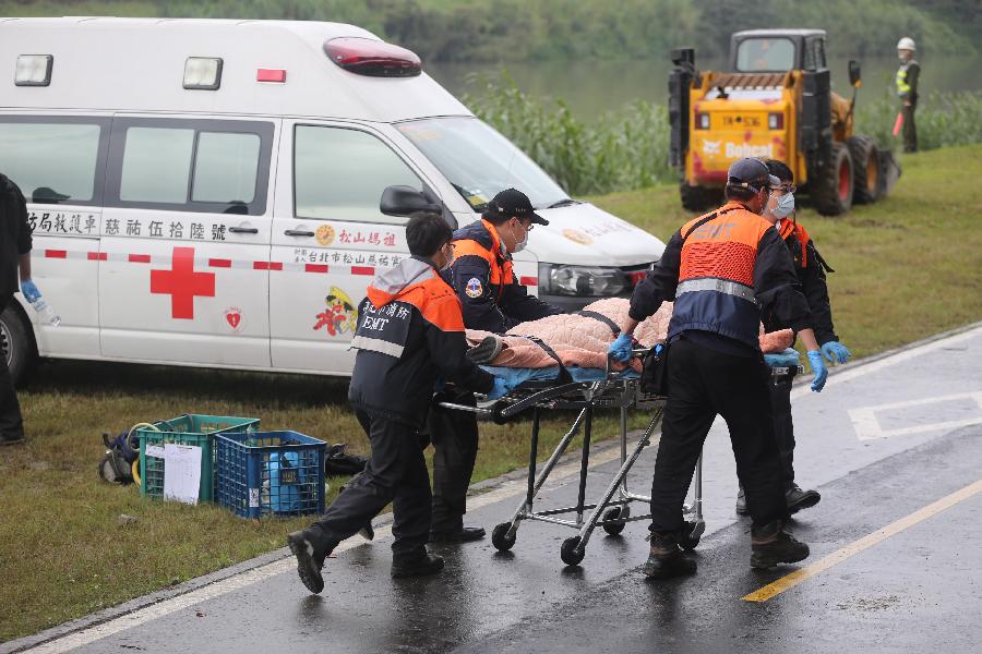 Rescuers transfer an injured passenger from a crashed plane in Taipei, southeast China's Taiwan, Feb. 4, 2015. A Taiwan TransAsia Airways plane crashed into a Taipei river on Wednesday morning, killing at least 12 people. Flight ATR-72, which was headed for Kinmen from Taipei, had 58 people on board, including 31 passengers from the Chinese mainland. It crash landed in the Keelung River after it clipped an elevated motorway with its wing. (Xinhua/Jin Liawng) |