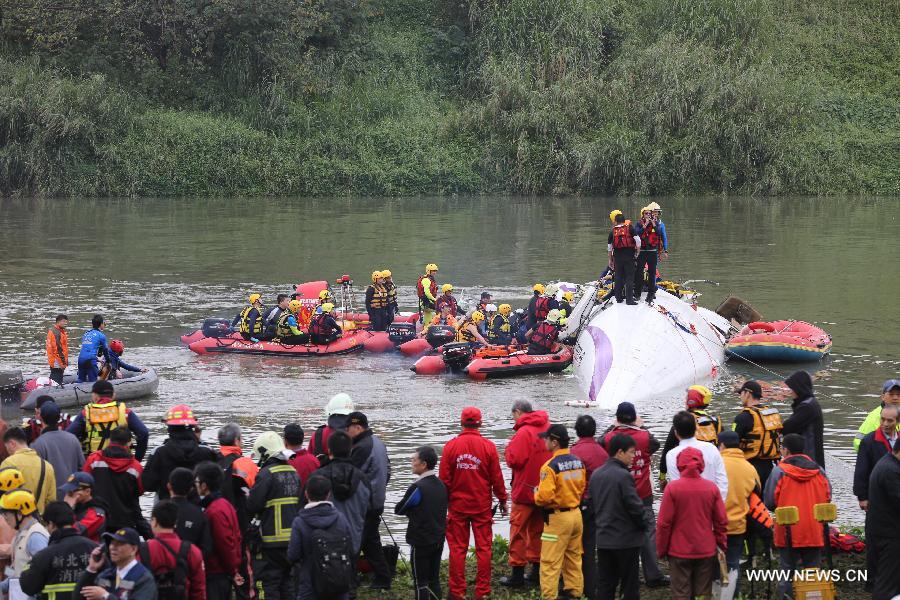 Rescuers work at the site where a plane plunged into a river in Taipei, southeast China's Taiwan, Feb. 4, 2015. A Taiwan TransAsia Airways plane crashed into a Taipei river on Wednesday morning, killing at least eight people. Flight ATR-72, which was headed for Kinmen from Taipei, had 58 people on board, including 31 passengers from the Chinese mainland. (Xinhua/Jin Liwang) |