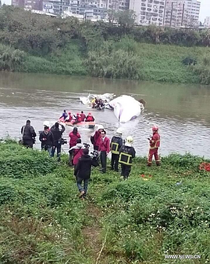 Rescuers work at the site of the plane accident in Taipei, southeast China's Taiwan, Feb. 4, 2015. A plane of the Taiwan TransAsia Airways came down into a Taipei river Wednesday, with more than 50 people on board, confirmed the civil aviation authorities of Taiwan. Contact with the ATR-72 Flight, scheduled from Taipei to Kinmen, lost at about 11 a.m. Then the plane was found in the river by the Nanhu Bridge. (Xinhua) |