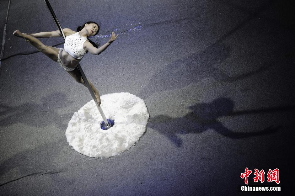 The qualification game of World Pole Dance Championship is held in Tianjin on Feb. 2, 2015. Seven members of the Chinese National Pole Dance Team competed for four berths. The 2015 World Pole Dance Championship will be held in China. (Chinanews/Tong Yu)
