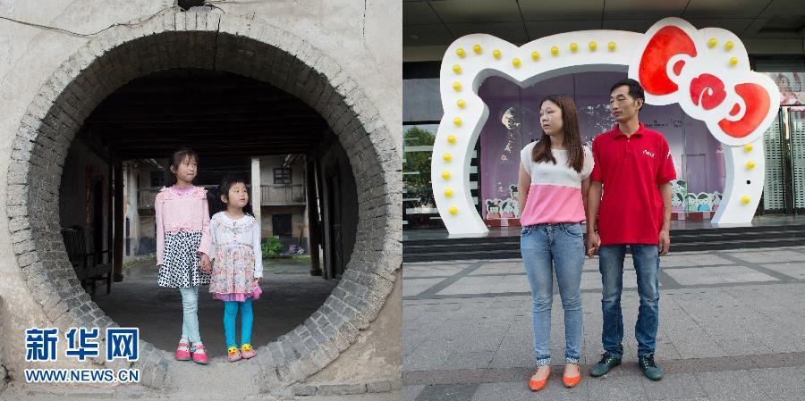 Left-behind girls stand in a doorway while their parents in front of a shopping mall. (Xinhua/Liu Jie)