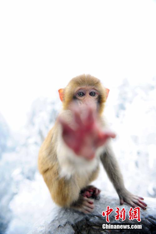A monkey plays in the snow world in Zhangjiajie National Forest Park in central China's Hunan province on Feb. 3, 2015. Its cute expressions melted the hearts of tourists. (Photo/CNS)