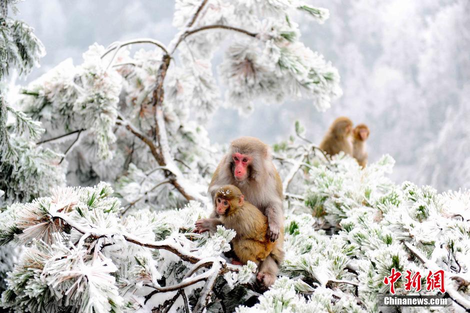 Monkeys play in the snow world in Zhangjiajie National Forest Park in central China's Hunan province on Feb. 3, 2015. Their cute expressions melted the hearts of tourists. (Photo/CNS)