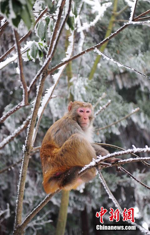 A monkey plays in the snow world in Zhangjiajie National Forest Park in central China's Hunan province on Feb. 3, 2015. Its cute expressions melted the hearts of tourists. (Photo/CNS)