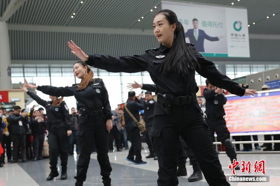 Female special police officers show fighting skill to passengers in Zhengzhou Railway Station on Feb. 3, 2015. (CNS/Yang Zhenghua)