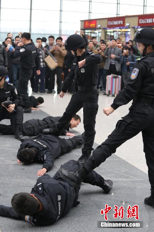 Female special police officers show fighting skill to passengers in Zhengzhou Railway Station on Feb. 3, 2015. (CNS/Yang Zhenghua)