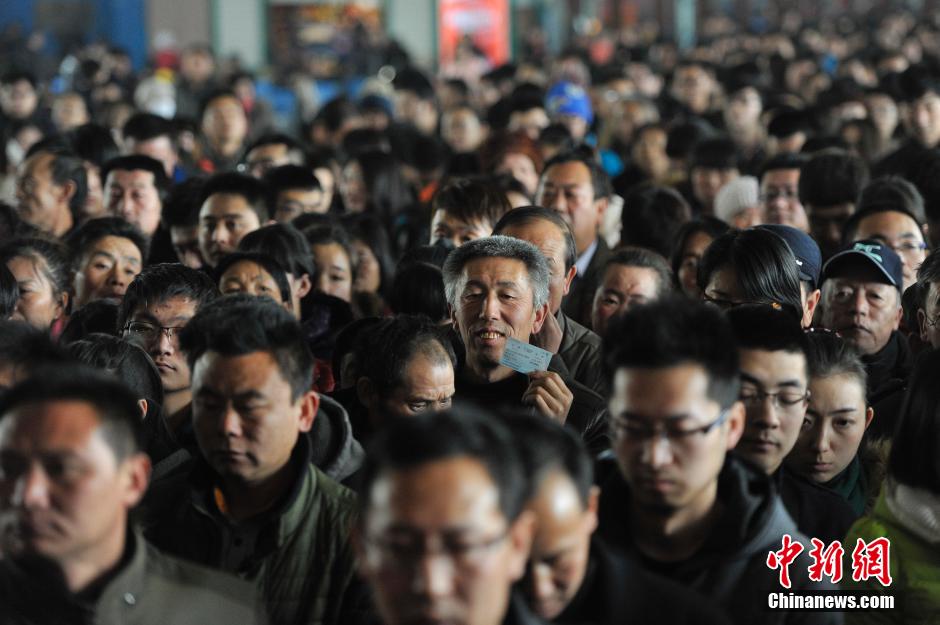 Passengers line up in the railway station in Taiyuan, capital of north China's Shanxi province, on Feb. 3, 2015. (CNS/Wei Liang)