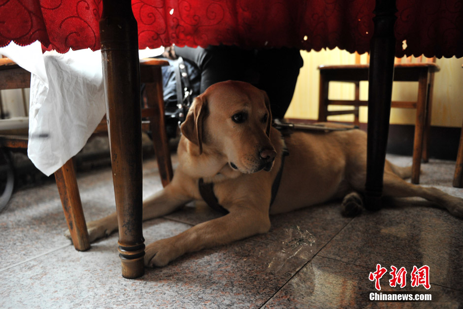Beijing has 67,000 blind people but it only has 10 guide-dogs for the blind. Most of the dogs are not welcomed in public area. A guide-dog can memorize more than 30 routes. Wu Wenhao runs a massage store with her boyfriend. Her guide-dog Zilong has accompanied her for two years since they met on June 6, 2013. The dog makes her travel more convenient and safer. Wu becomes more patient and happier after she had the dog in her life. (Photo/Jin Shuo) |