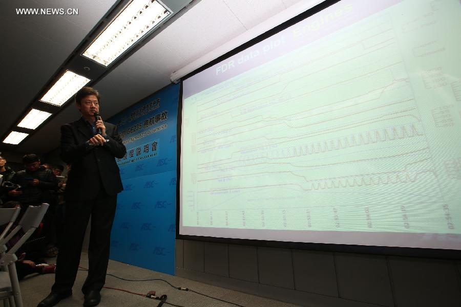 Aviation Safety Council Executive Director Thomas Wang briefs on the investigation of TransAsia Airways Flight GE235 occurrence at a press conference in New Taipei City of southeast China's Taiwan, Feb. 6, 2015. Authorities analyzed the plane's two flight data recorders, or "black boxes", and voice recordings recovered from the plane after it crashed into the Keelung River after takeoff from Songshan Airport at 10:52 a.m on Feb. 4. A preliminary report on the accident will be released within 30 days. (Xinhua/Jin Liwang)
