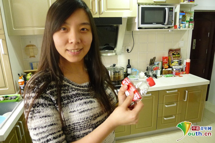 Xiao Ji twists the plastic bottle into smaller ones after she drinks the water. In this way she can decrease the volume of rubbish. (Youth.cn/Gao Lei)
