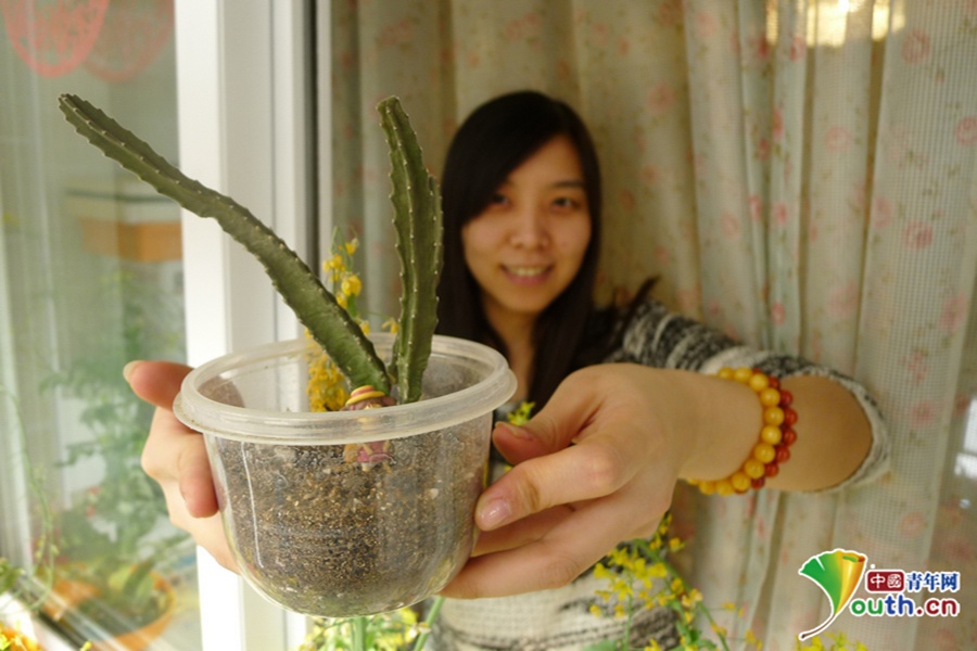 Xiao Ji grows flowers in the plastic lunch-box. (Youth.cn/Gao Lei)