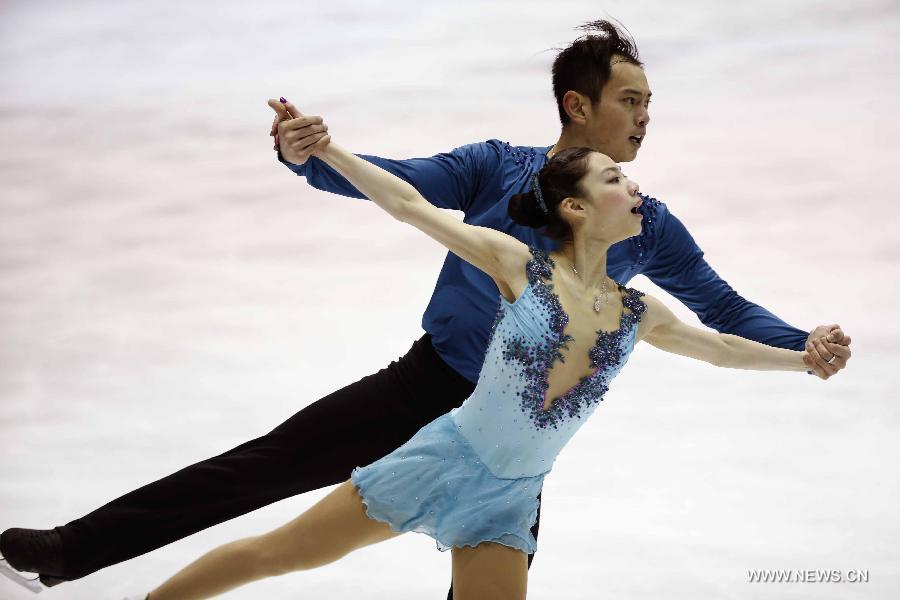Yu Xiaoyu (front) and Jin Yang perform during the final of pairs free skating at the 27th World Winter Universiade in Granada, Spain, Feb. 7, 2015. The Chinese pair claimed the title with 181.92 points in the event, the first gold medal of the Chinese delegation. (Xinhua/Meng Yongmin) |