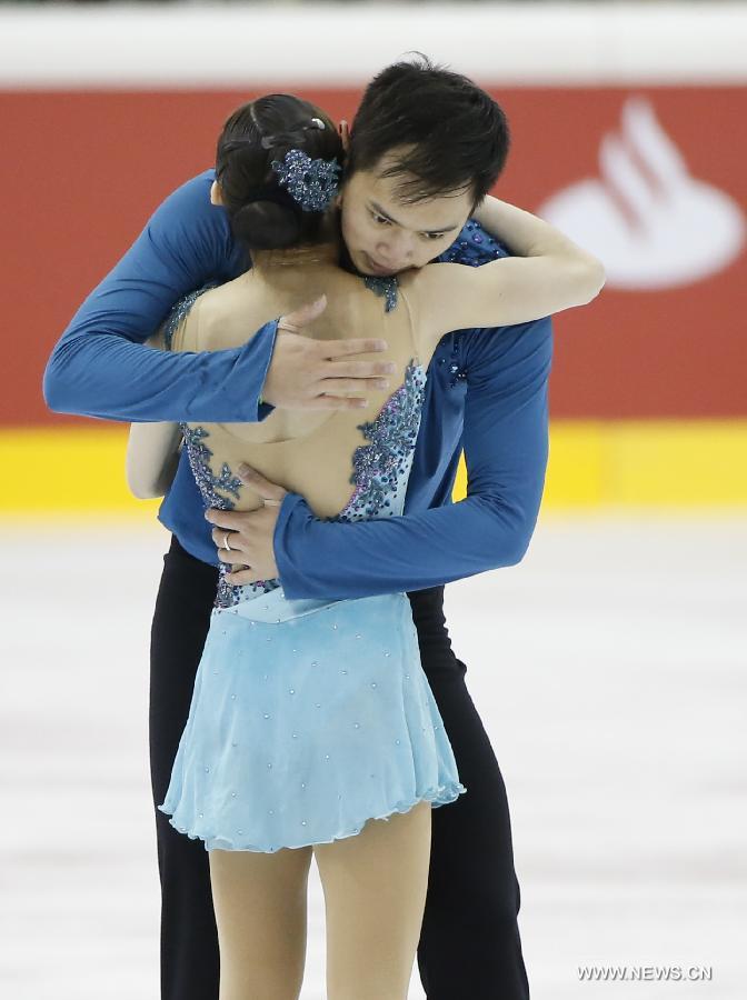 Yu Xiaoyu (Front) and Jin Yang hug to celebrate after the final of pairs free skating at the 27th World Winter Universiade in Granada, Spain, Feb. 7, 2015. The Chinese pair claimed the title with 181.92 points in the event, the first gold medal of the Chinese delegation. (Xinhua/Meng Yongmin) |