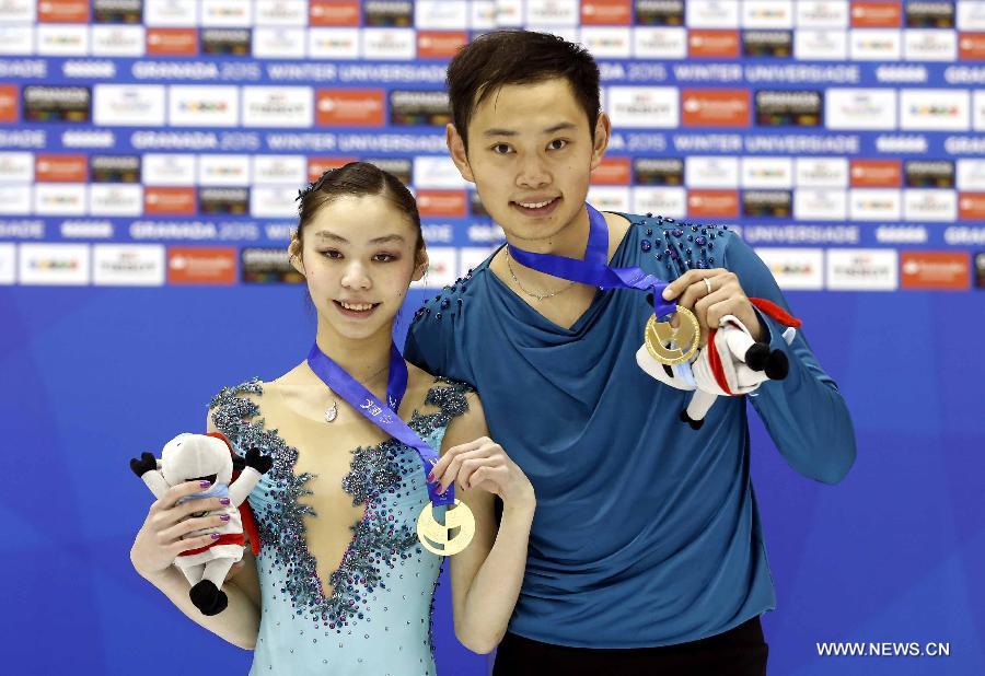 Yu Xiaoyu (L) and Jin Yang pose for photos after winning the final of pairs free skating at the 27th World Winter Universiade in Granada, Spain, Feb. 7, 2015. The Chinese pair claimed the title with 181.92 points in the event, the first gold medal of the Chinese delegation. (Xinhua/Meng Yongmin) |