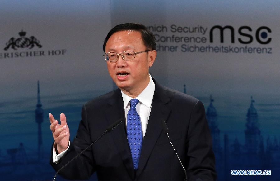 Chinese State Councilor Yang Jiechi speaks at the opening panel of the 51st Munich Security Conference (MSC) in Munich, Germany, Feb. 6, 2015. China on Friday called for fostering a vision of a common, comprehensive, cooperative and sustainable security, said Yang Jiechi in Munich. (Xinhua/Luo Huanhuan) |