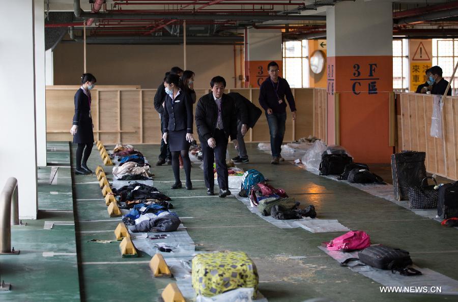 People claim the belongings of victims of the plane crash in Taipei, southeast China's Taiwan, Feb. 7, 2015. A plane of TransAsia Airways crashed in the Keelung River Wednesday morning after its wing clipped a taxi on an elevated freeway 10 minutes following takeoff. (Xinhua/Jin Liwang) |