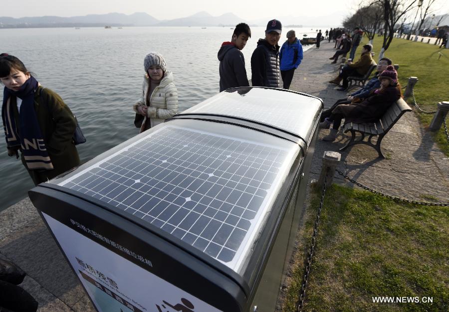 People walk past a solar power aptitude compressing dustbin newly set in the West Lake scenic spot in Hangzhou, capital of east China's Zhejiang Province, Feb. 7, 2015. Ten suits of solar power aptitude compressing dustbins were set here on Saturday, which could automatically compress trashes thrown in. (Xinhua/Ju Huanzong) |