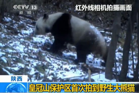 The still from a China Central Television (CCTV) news program shows the wild giant panda observed by a camera in the Huangguan Mountain Reserve on December 11, 2014. (Photo/CCTV News)
