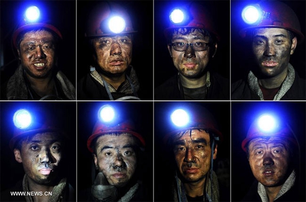 Combo photo taken on April 22, 2014 shows the portraits of miners in a coal mine in north China's Shanxi province. [Photo: Xinhua] |