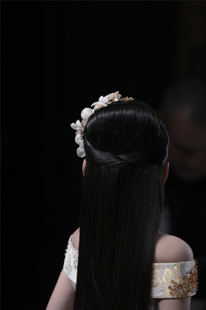 Xiuqiu, a nine-year-old Chinese girl, appears at the 2015 Haute Couture Spring-Summer collection fashion show in Paris. The girl is the first Chinese child model at Paris fashion show. She has won high appreciation from the fashion circle with her unique Chinese character and professional presentation. (Photo/Xinhua)