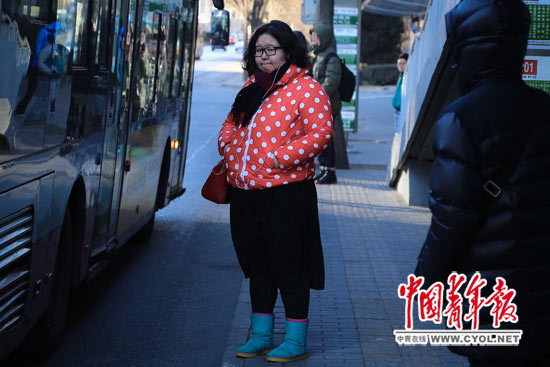A fashionable girl waits for bus at Yuhuili bus stop. (Photo/China Youth Daily)
