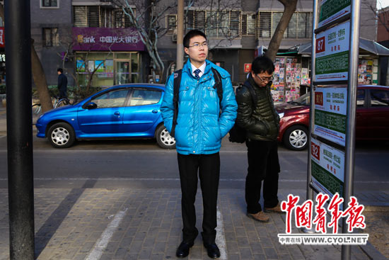 Qiu Huahua, will take part in an examination of a business bank, waits at Zaojunmiao bus stop. (Photo/China Youth Daily)
