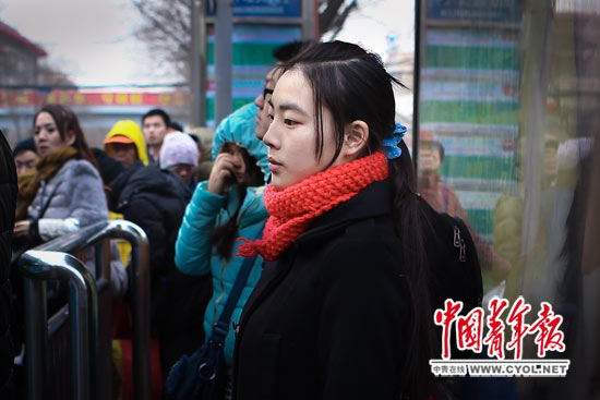 Gaojing, who does part-time job in a western restaurant, waits for bus at Foreign Trade University bus stop. (Photo/China Youth Daily)