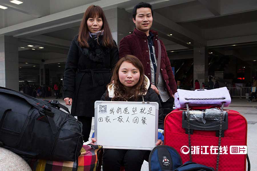 Chen Mei (middle) has not seen her six-year-old child for one year and misses her child very much. She wishes for a family reunion during the Spring Festival.(Photo/zjol.com.cn)