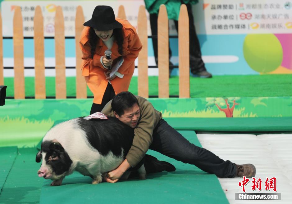A fun race is held in Changsha, central China’s Hunan province on Feb. 8, 2015. The participants were required to run on a 20 meters long ice track with a pig in arms and kiss the pig at the end point. (Chinanews/Yang Huafeng)