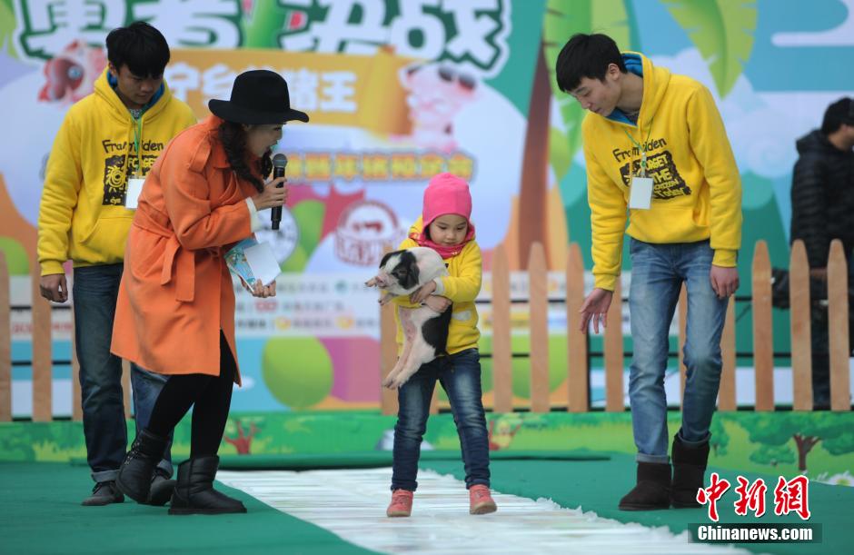A fun race is held in Changsha, central China’s Hunan province on Feb. 8, 2015. The participants were required to run on a 20 meters long ice track with a pig in arms and kiss the pig at the end point. (Chinanews/Yang Huafeng)