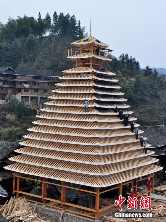 Dong people (a minority of China) build a drum tower to welcome the Chinese New Year in Pingyan village of Sanjiang county, south China’s Guangxi Zhuang autonomous region on Feb. 7, 2015. The drum tower is regarded as the soul of a Dong village and the construction is funded by all the villagers. (Chinanews/Gong Pukang) |