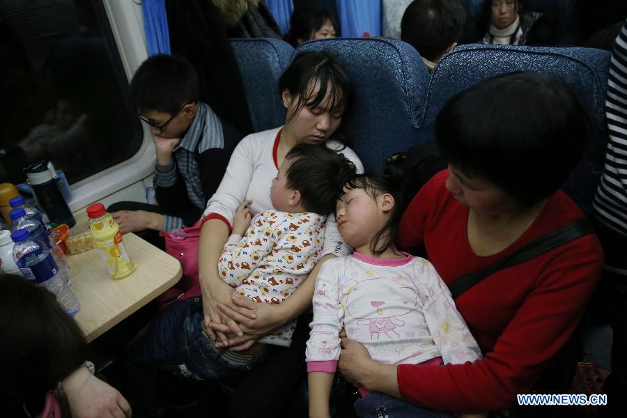 Children have a sleep in parents' arms on train 3663, which runs from east China's Shanghai to Chengdu, capital of southwest China's Sichuan Province, on Sept. 9, 2015. The Spring Festival, or the Chinese lunar New Year which starts from Feb. 19 this year, is known as the world's biggest migration, with millions of people traveling vast distances for family reunions. (Xinhua/Ding Ting) |