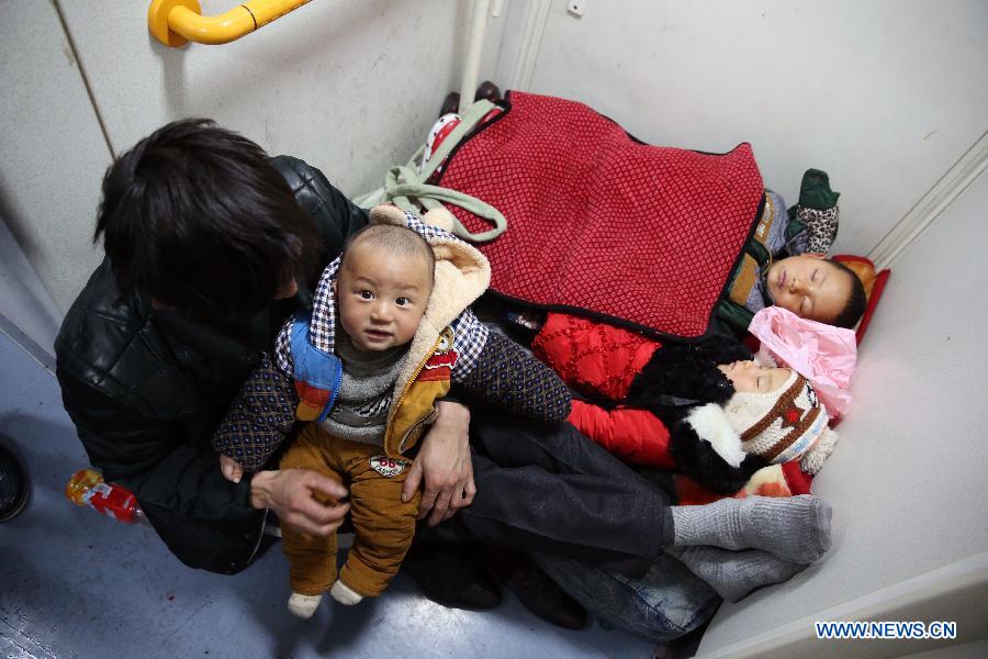 Children have a sleep on the ground of train 3663, which runs from east China's Shanghai to Chengdu, capital of southwest China's Sichuan Province, on Sept. 9, 2015. The Spring Festival, or the Chinese lunar New Year which starts from Feb. 19 this year, is known as the world's biggest migration, with millions of people traveling vast distances for family reunions. (Xinhua/Ding Ting) |