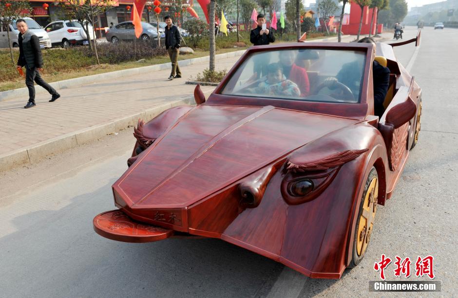The mahogany roadster made by a farmer drives in the street of Guangfeng county, Jiangxi province. (Photo/CNS)
